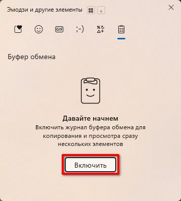 После нажатия горячих клавиш Win+V откроется окно, где будет предложено Включить журнал буфер обмена.