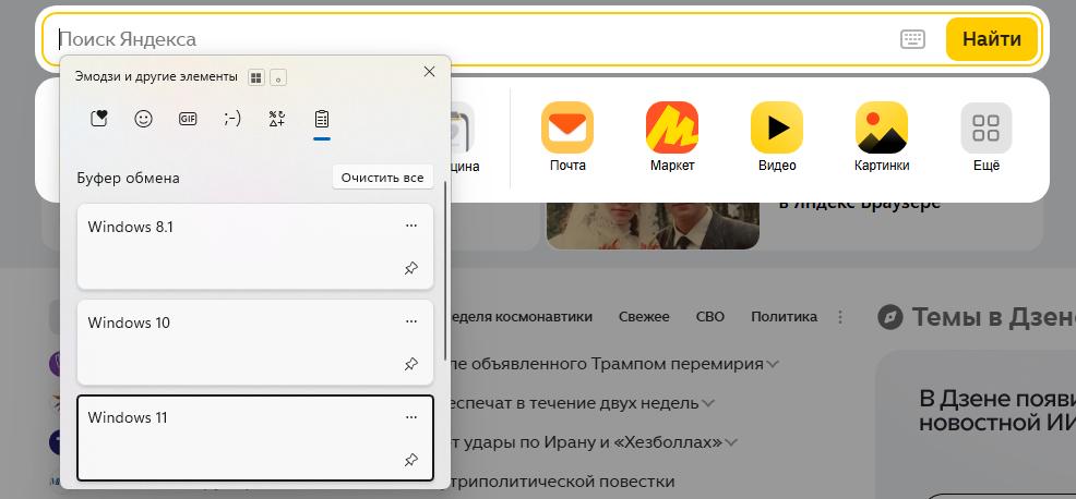 Я скопировал несколько фрагментов текста, давайте посмотрим историю расширенного буфера обмена. Для этого, нажимаем сочетания клавиш Win+V на клавиатуре.